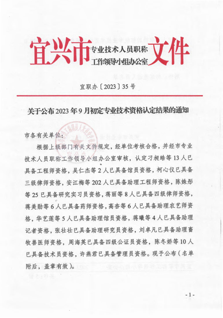 关于公布2023年9月初定专业技术资格认定结果的通知