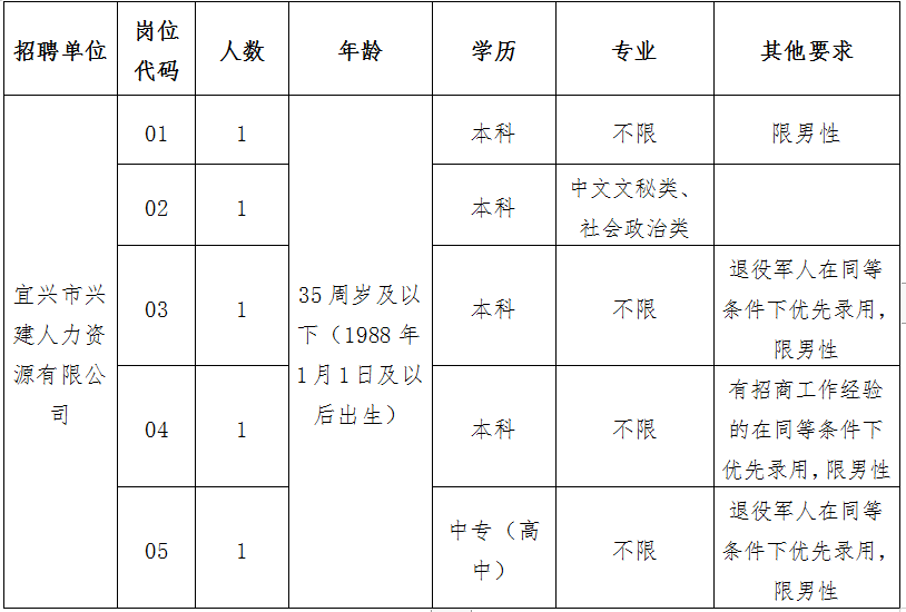 因工作需要,按照“公开、公平、公正”的原则,根据《市政府办公室关于印发〈宜兴市镇级编外用工管理暂行实施办法〉的通知》(宜政办发〔2017〕141号)文件规定,经新建镇党委、政府研究决定,镇政府下属国企宜兴市兴建人力资源有限公司公开招聘招聘编外工作人员5人。现将有关事项公告如下: