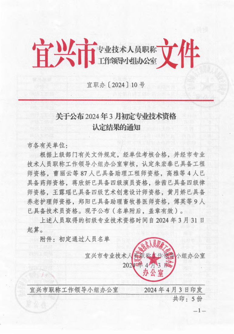 关于公布2024年3月初定专业技术资格认定结果的通知