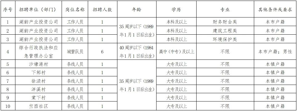 根据工作需要,按照“公开、公平、公正”的原则,经周铁镇党委、政府研究决定,面向社会公开招聘宜兴市湖韵产业投资有限公司工作人员3名,综合行政执法和应急管理办公室城管队员6名,村(社区)条线工作人员6名。现将有关事项公告如下: