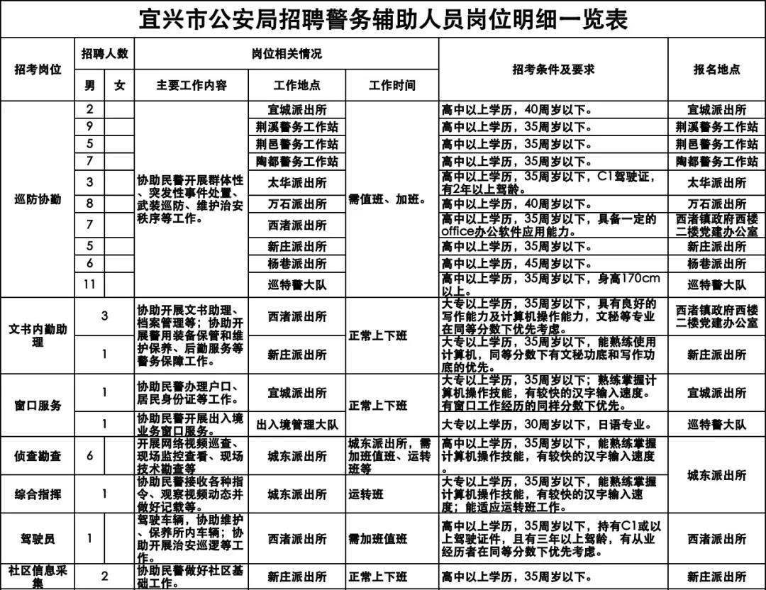 (三)报名材料:(1)本人身份证、毕业证、户口簿、专业资格证书、驾驶证(退伍军人需提供退伍证)等原件及复印件;(2)填写《宜兴市公安局警务辅助人员报名表》,并交近期一寸正面免冠照片2张。
